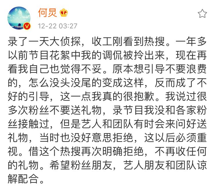 被深扒发酵一晚上后,12月22日凌晨三点,何炅终于在微博上回应。