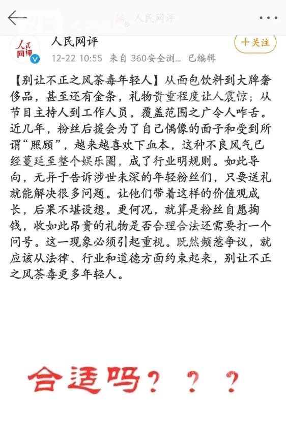 12月22日10点55分,明星收礼现象被人民网点名批评。