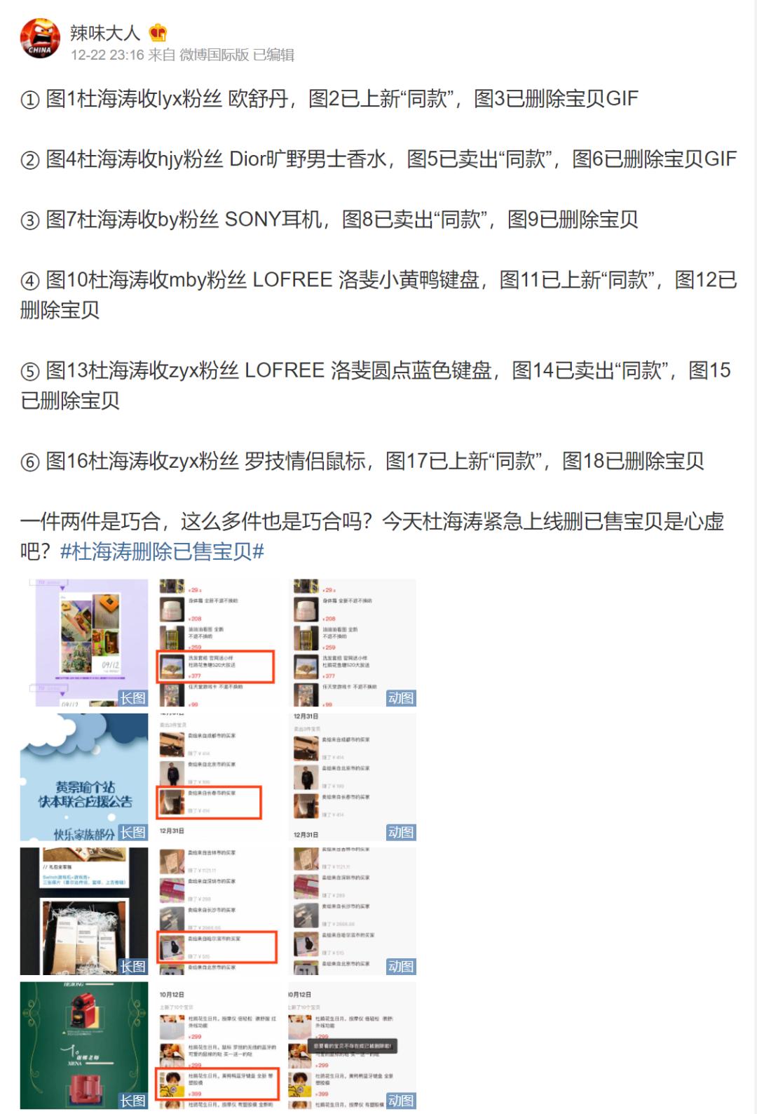 12月22号下午,有网友在微博评论区质问杜海涛,为什么要卖掉粉丝应援礼?随后,#杜海涛删除已售宝贝#上了热搜。