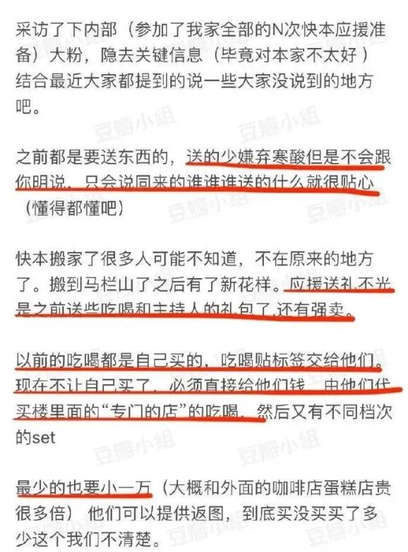 12月23日凌晨,曾经参与过应援的粉丝们爆料,除了送礼,快本还有食物应援环节。而在食物应援中,快本采取的是“强买强卖”的模式。以前给节目组购买下午茶是后援会自己购买,由工作人员带入场内;现在则必须把钱直接给工作人员,由他们代为采购。