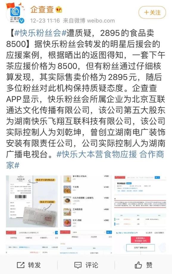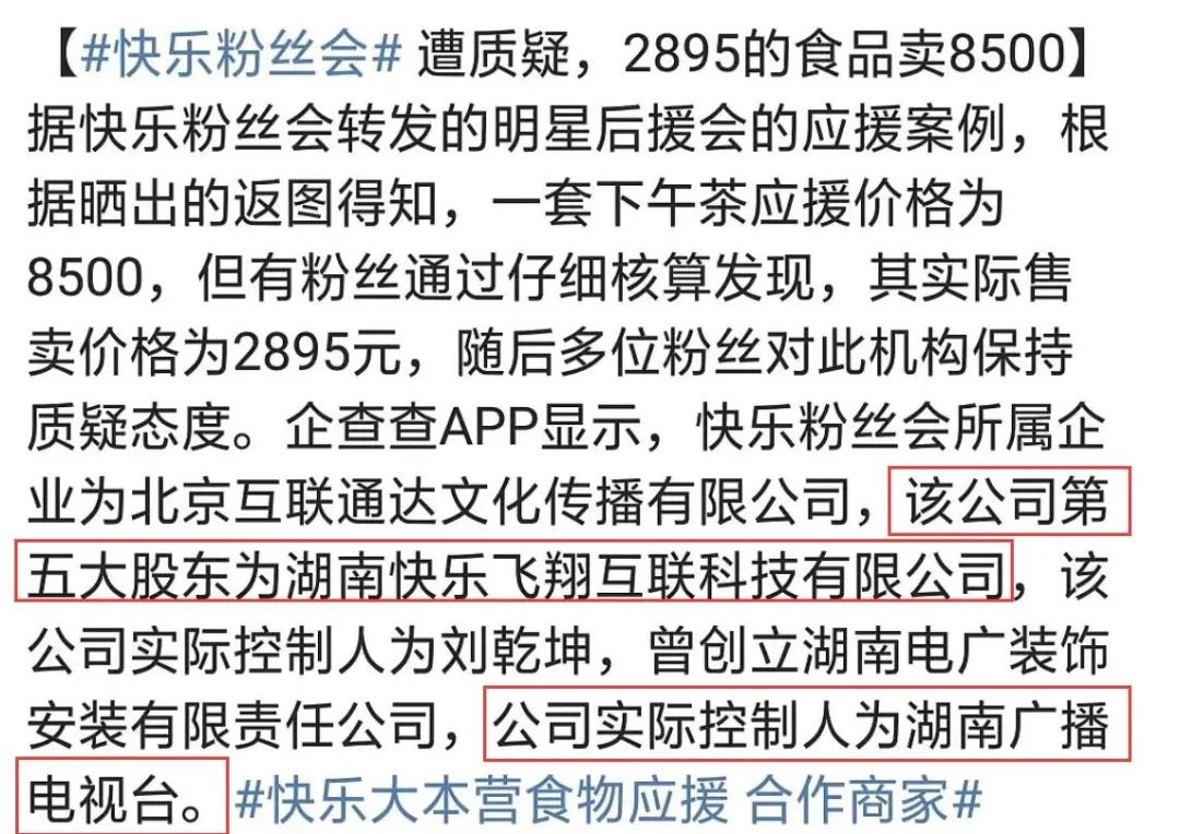 套餐选定之后,粉丝们的食物应援必须通过“快乐粉丝会”送到后台。根据“企查查”的资料,这个“快乐粉丝会”所属的企业是北京互联通达有限公司,该公司实际控制人为湖南广播电视台。