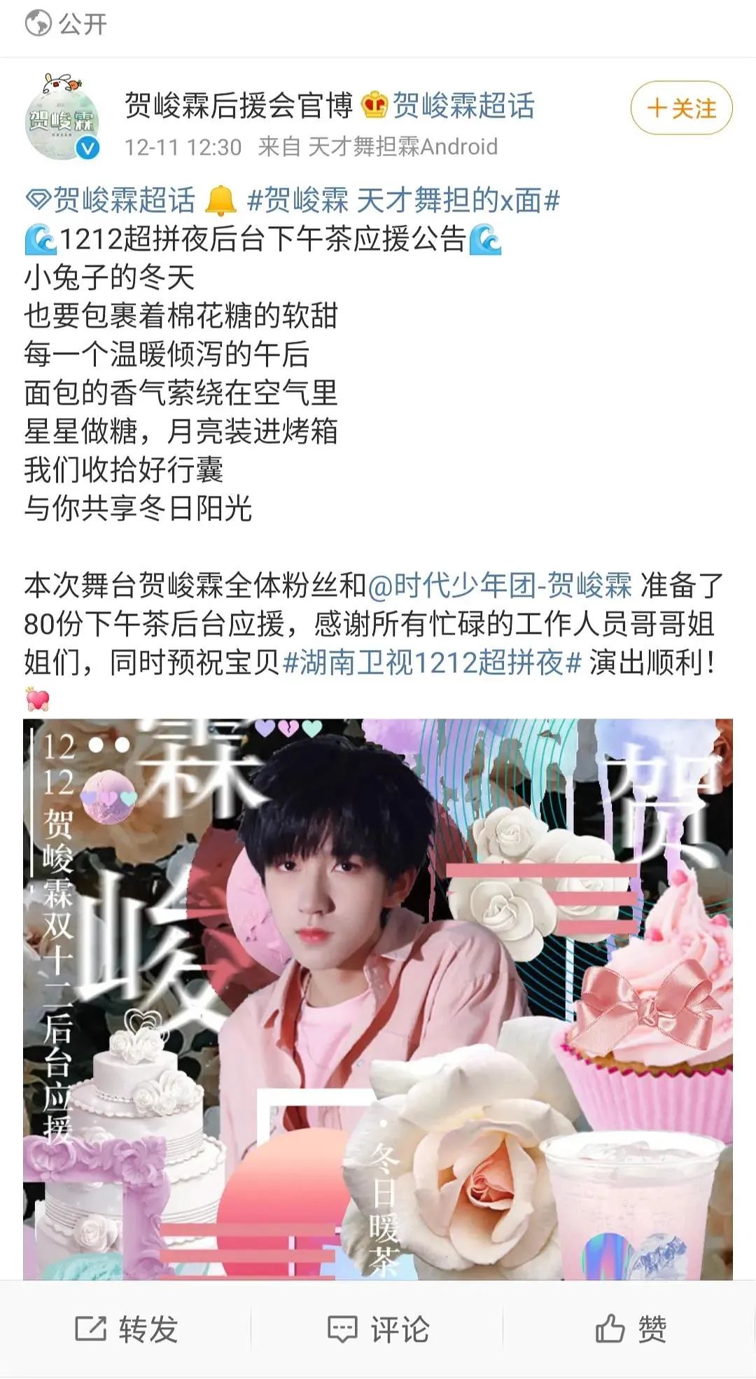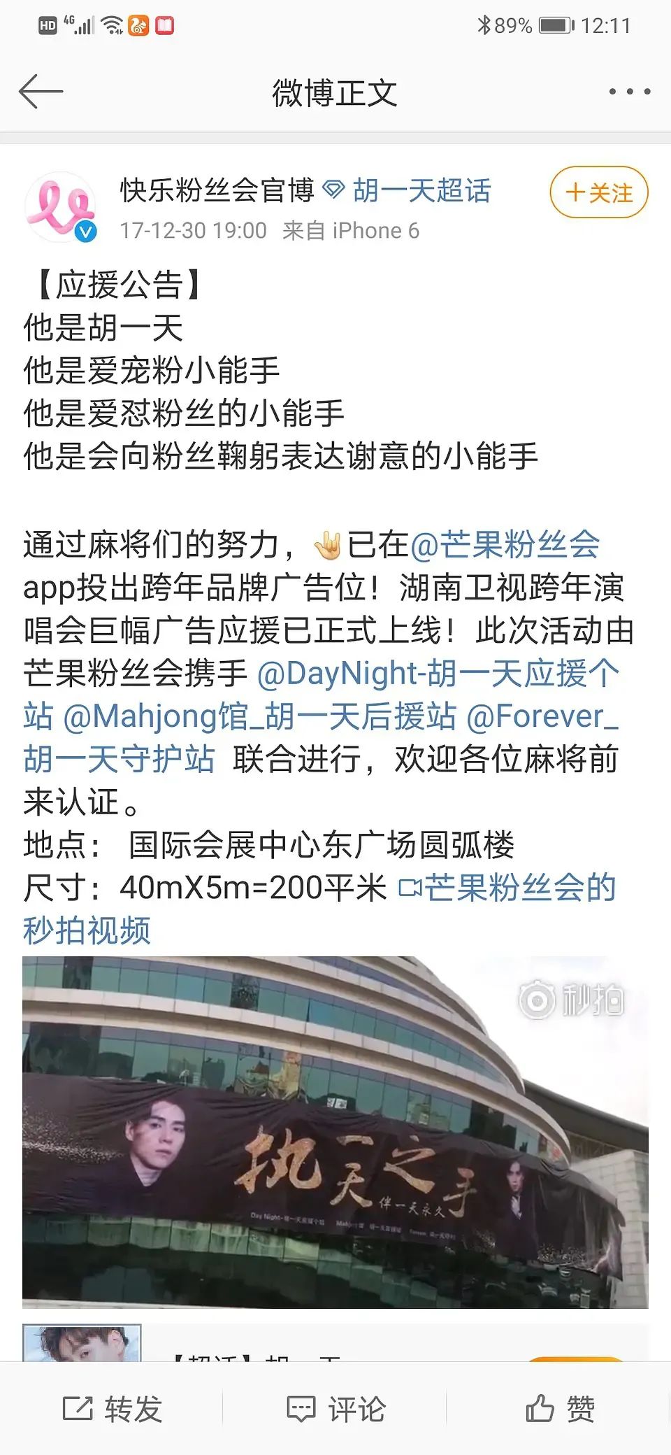 “快乐粉丝会”的业务很广泛,不只是下午茶,还有应援花墙、应援立板等。2017年,跨年场外影院广告位被“快乐粉丝会”明码标价六万多,卖给了粉丝。