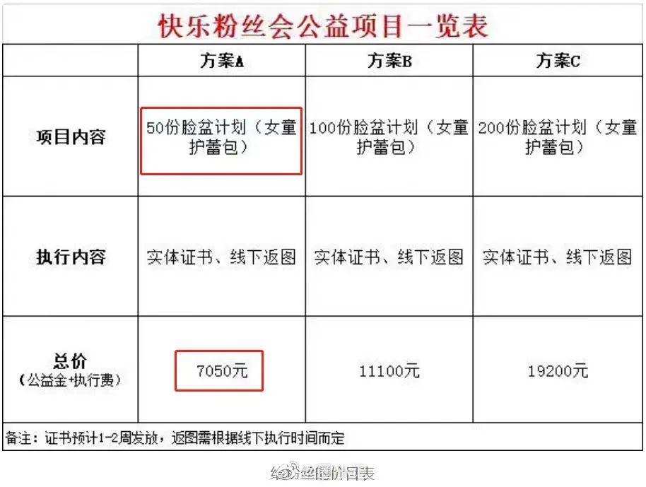 后援会还有快乐粉丝会公益项目的明细表。以50套要价7050计算,一人一套肥皂毛巾要将近140元。在另一家的预算表中,同样的物品只需要81元,价格有中间“掺油水”的嫌疑。