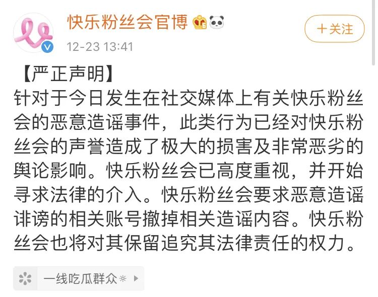 12月23日13:41,快乐粉丝会发布声明,否认了社交媒体上关于粉丝会的传言,称其为恶意造谣事件。但网友们并不买账,要求其公开资金流向细节。
