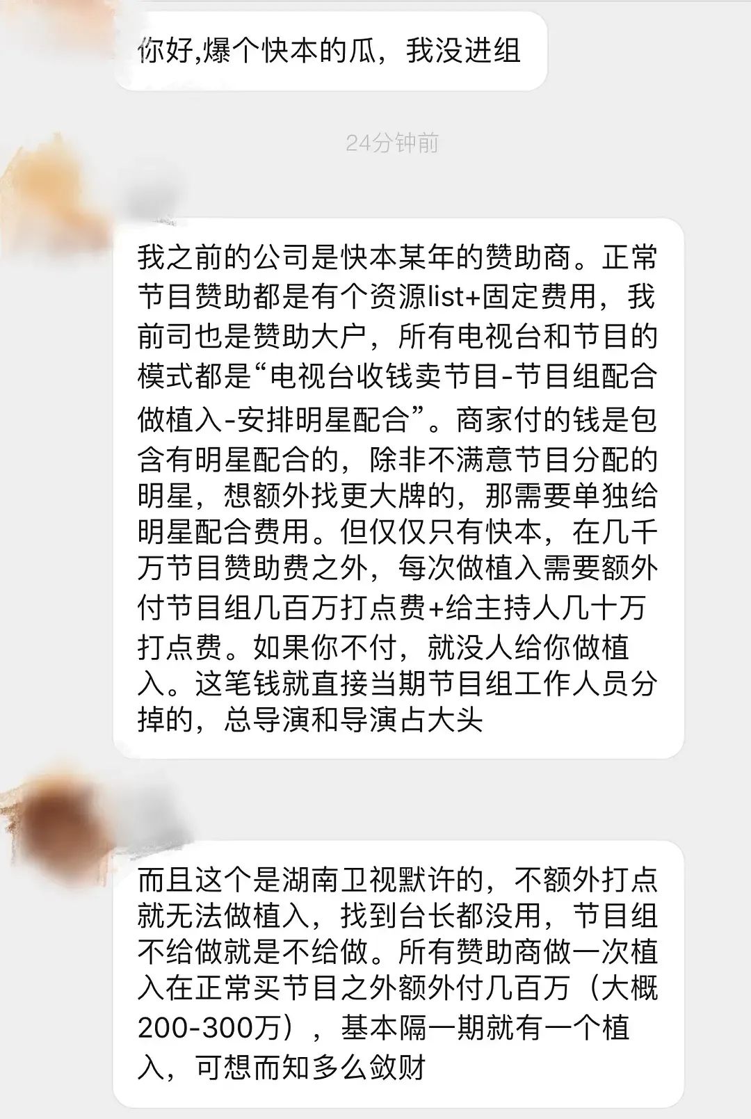 快本的一家赞助商员工也爆料称,快本在几千万节目赞助费之外,还打破行业常规模式,要额外的几百万用来打点节目组和主持人。