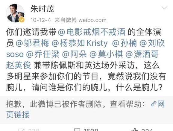 朱时茂十年前的一件事也被挖了出来。2010年,朱时茂曾发博怼了《快乐大本营》。原因是,他为了宣传新电影,拉了陈佩斯、杨恭如、英达、邬君梅等人进行快本场外采访,结果《快乐大本营》以“没有腕儿”为由告知节目不录了。