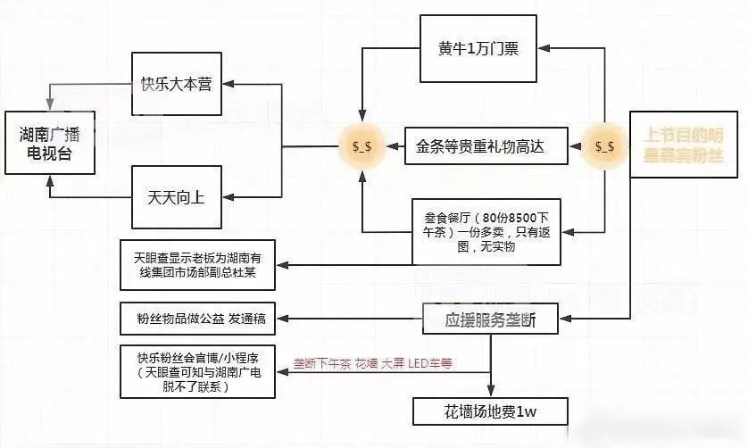 如果事实真是如此的话,“朱时茂和陈佩斯同综艺”的名场面就这样被错过了。事情发展到现在,有人将应援背后的深层脉络做了一张图,表面上简单的明星收礼事件,深挖下去,越挖越烂,延伸到了电视台内部运作机制,乃至行业生态扭曲的问题。