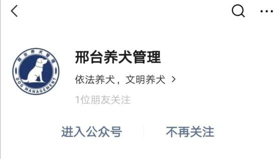 为进一步做好养犬管理工作,切实为群众提供便利和服务,市公安局开通了“邢台养犬管理”微信公众号。该公众号正式上线后可实现犬证办理、缴费、年检、举报、更改信息等在线办理功能,养犬人关注“邢台养犬管理”微信公众号,填写基本信息注册后上传身份证照片、犬只照片、免疫证明等即可办理养犬相关事项。