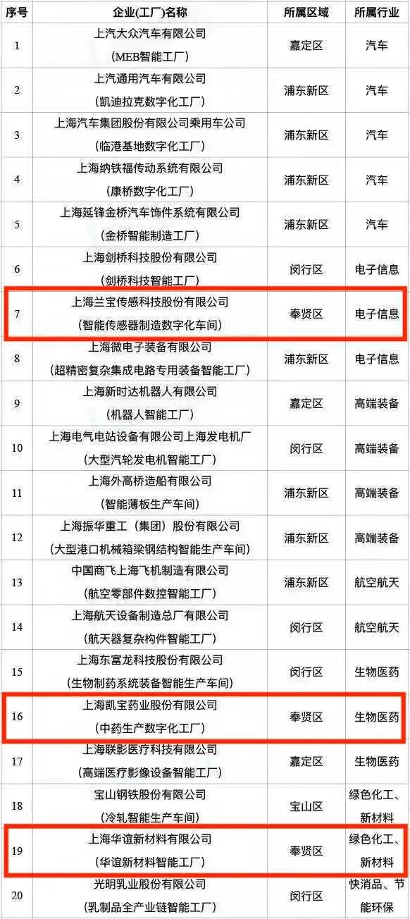 在此次上海市首批授牌成立的20家智能工厂中,奉贤有上海兰宝传感科技股份有限公司(智能传感器制造数字化车间)、上海凯宝药业股份有限公司(中药生产数字化工厂)、上海华谊新材料有限公司(华谊新材料智能工厂)3家企业名列其中。