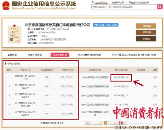 记者查询国家企业信用信息公示系统显示,“米扬丽格”自2017年5月以来,已被市场监管部门处罚5次。最近的一次行政处罚是2020年1月14日,北京市朝阳区市场监管局认定,“米扬丽格”违反了《医疗广告管理办法》第七条第一款第(六)项的规定,构成了利用患者形象作证明发布医疗广告的违法行为,依据《医疗广告管理办法》第二十二条的规定,责令其立即停止违法行为,罚款1万元。