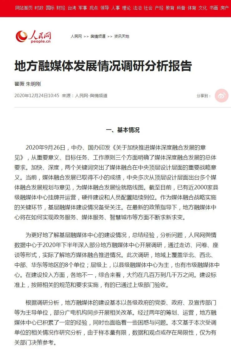 一、基本情况2020年9月26日,中办、国办印发《关于加快推进媒体深度融合发展的意见》,从重要意义、目标任务、工作原则三个方面明确了媒体深度融合发展的总体要求。加快、深度,两个关键词突出了媒体融合在中央顶层设计层面的重要战略意义。当前,媒体融合发展已取得不小的成绩,中央多次从顶层设计层面出台多个媒体融合发展规划与意见,为媒体融合发展绘就路线图。截至目前,已有近2000家县级融媒体中心挂牌并运营,硬件建设和人员配置陆续到位。作为媒体融合战略实施的关键环节,基层融媒体建设情况备受关注。在最新的政策指导下,地方融媒体中心将在如何实现政务服务、媒体服务、智慧城市等方面不断求新求变。