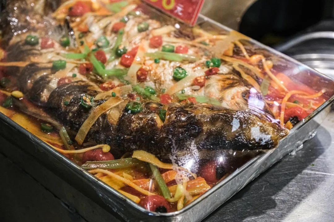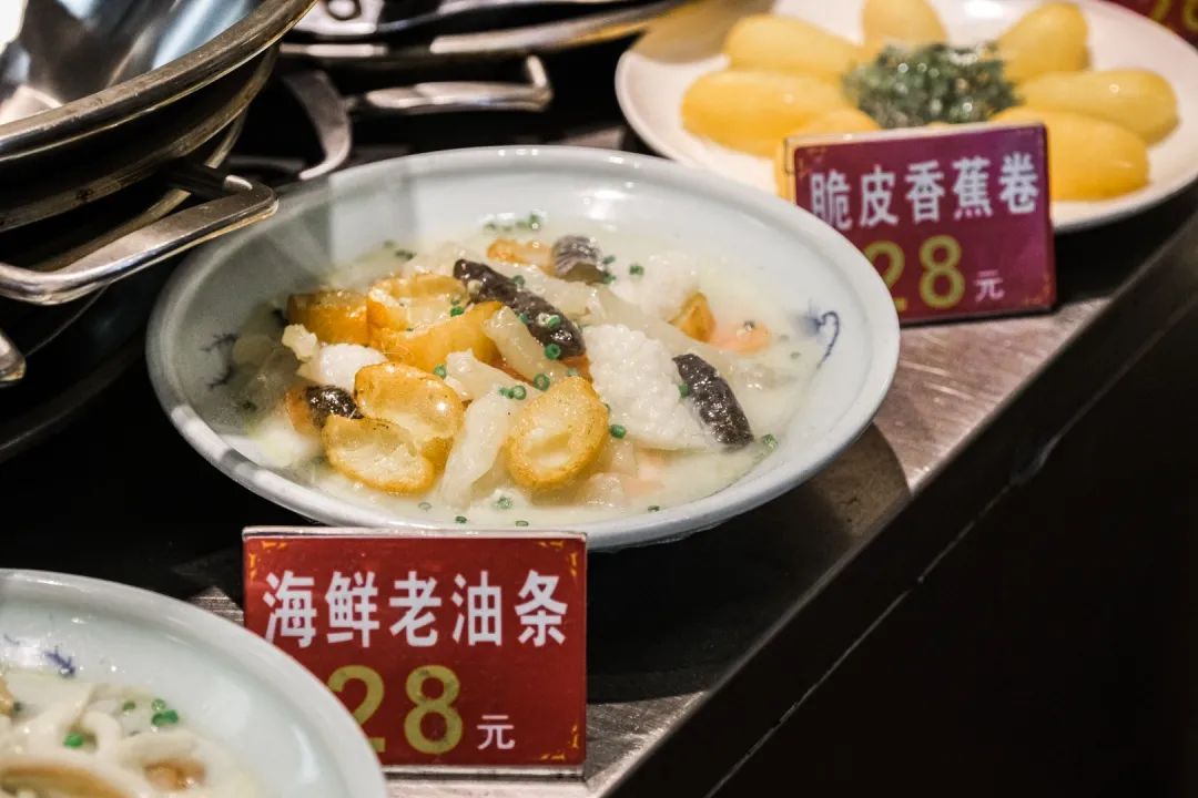 有时候菜式太多也有烦恼,比如说“脆皮香蕉卷”,光看名字还真的想不出是什么。刚好去厨房看看,这里摆着现成的菜,一边看菜一边点菜,特别有老饭店的风格。② 带肥膘的椒盐蹄髈