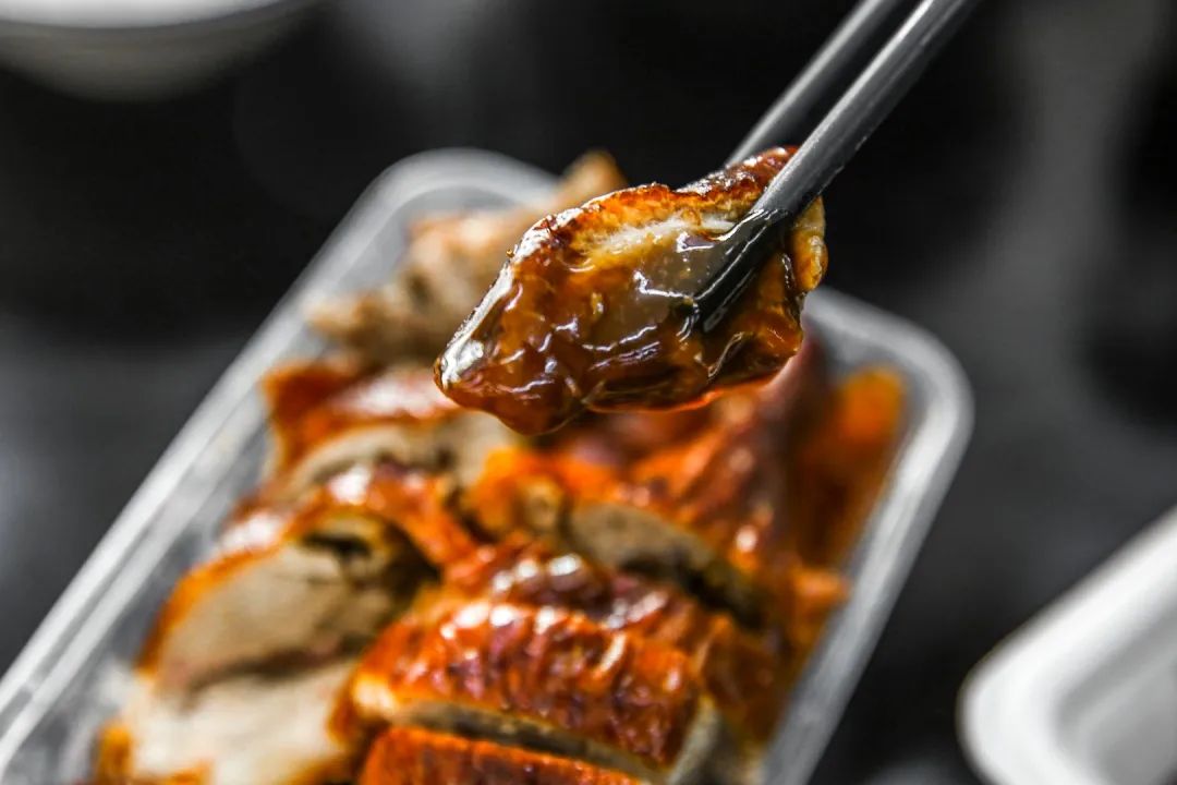 老板一家3口通力合作,有人负责烤有人负责卖,早上烤一波,下午烤一波。鸭子活杀、现烤、现斩,鸭肉烧得均匀细嫩,皮薄得像是玻璃纸,一捅就破了。① 有分店,都出名了