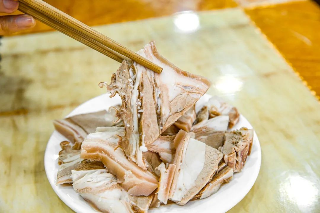老人在木渎镇吃着藏书羊肉长大,所以认准了苏州的羊肉,店里的肉也是特地从苏州运过来的。白切肉,用清汤熬煮,酥而不烂,可以蘸着甜面酱或者酱油吃。