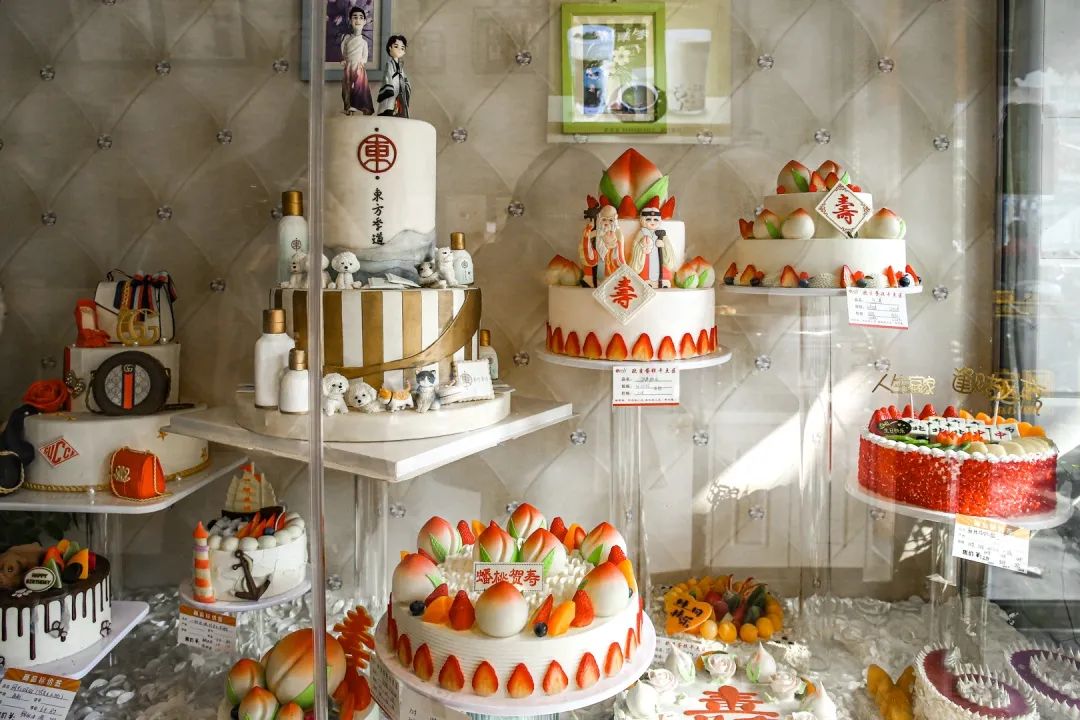 店里最厉害的是能定做好几层的蛋糕,GUCCI、法拉利、仙女裙、寿桃...有人说款式像是70年代的,有人乐得买回家给家里人庆生、祝寿。