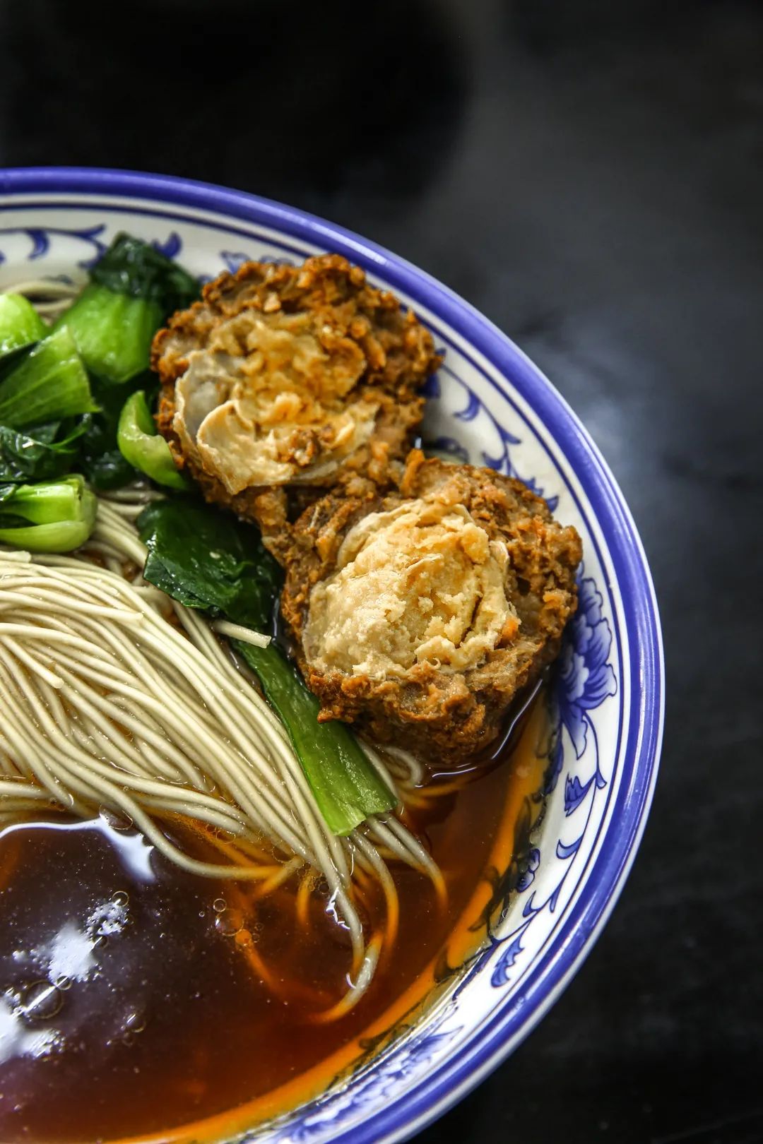 招牌是1颗咸蛋黄狮子头,有拳头大,夹不起来,得戳着吃。肉很紧,中间裹着咸蛋黄和一层薄薄的咸蛋白,配着鲜美的汤头,色色一一。② 最便宜9元/碗