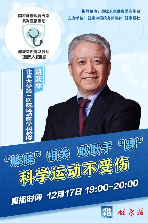 12月17日,北京大学第三医院运动医学科胡跃林教授做客国家健康科普专家系列直播活动 “健康大咖谈”直播现场,为公众带来题为《“膝膝”相关 、耿耿于“踝” 科学运动不受伤》的运动医学知识。