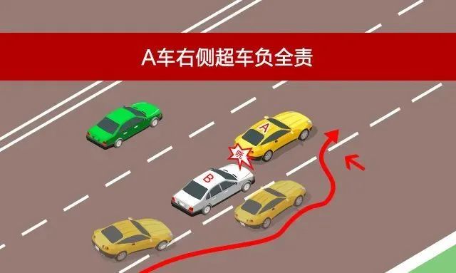A车、B车在同一车道内行驶,如果A车在“右侧超车”时发生碰撞事故,被追尾的A车须负全责。