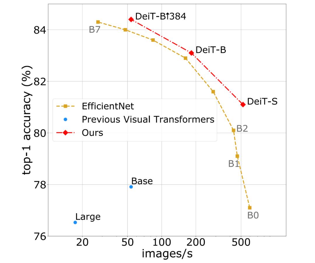 该研究提出的方法(DeiT 和带蒸馏的 DeiT)与以前的视觉 Transformer 模型以及 SOTA CNN 的性能曲线对比,这些模型均在 ImageNet 上训练而成。
