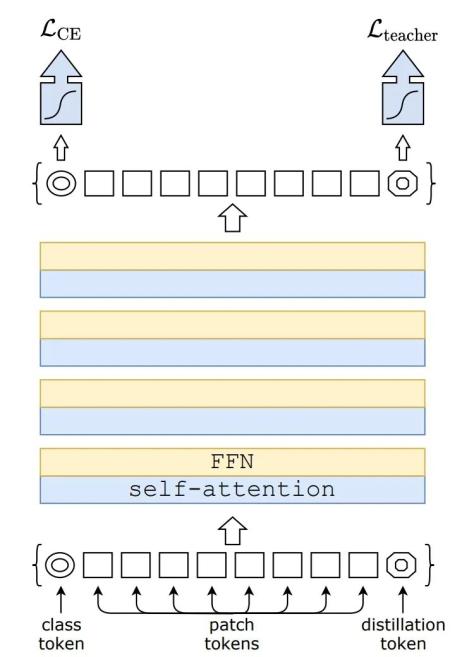 蒸馏流程如下图所示。研究者仅添加了一个新的蒸馏 token,它通过自注意力层与 class token 和 patch token 交互作用。蒸馏 token 的作用与 class token 类似,不过前者的目的是复制教师网络预测的(硬)标签,而不是正确标签。Transformer 的 class token 和蒸馏 token 输入均通过反向传播学得。