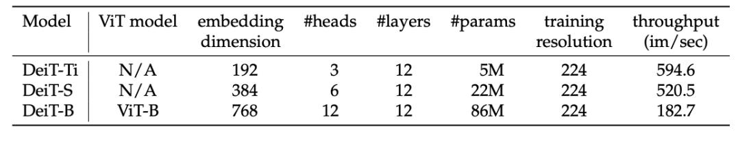表 1:DeiT 架构变体。DeiT-B 是其中较大的模型,架构与 ViT-B 相同,但是训练策略和蒸馏 token 不同;DeiT-S 和 DeiT-Ti 是两个较小的模型。
