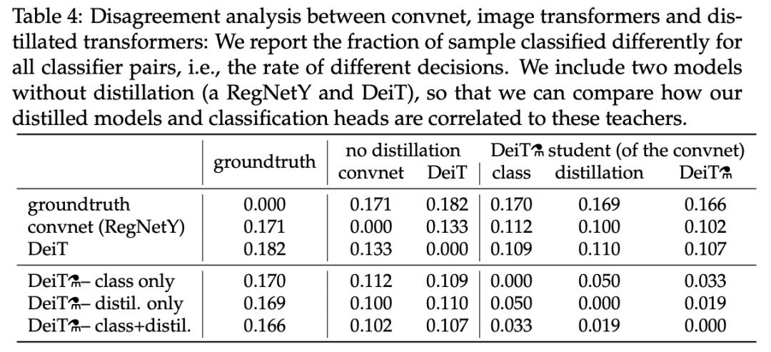 从中可以看出,该研究提出的蒸馏模型与 convnet 的相关性强于从头开始学习的 transformer。使用蒸馏嵌入的分类器与 convnet 的差距比使用类别嵌入的分类器更小,使用类别嵌入的分类器更类似未经蒸馏的 DeiT。class+distil 分类器处于中间地带。