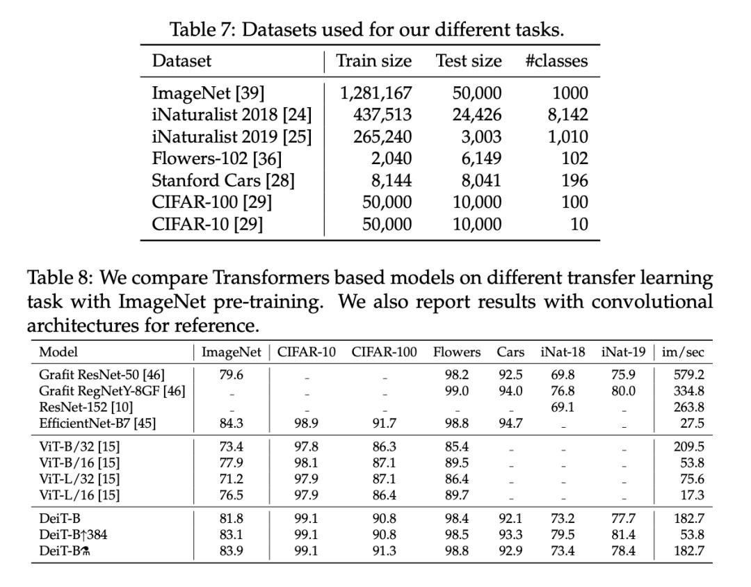 研究者通过对下表 7 中的数据集进行微调,在迁移学习任务上对此进行了评估。下表 8 则将 DeiT 迁移学习结果与 ViT 和 SOTA 卷积架构的结果进行了比较。该研究发现 DeiT 的结果和最佳卷积的结果相当,这和此前在 ImageNet 数据集上的结论是一致的。