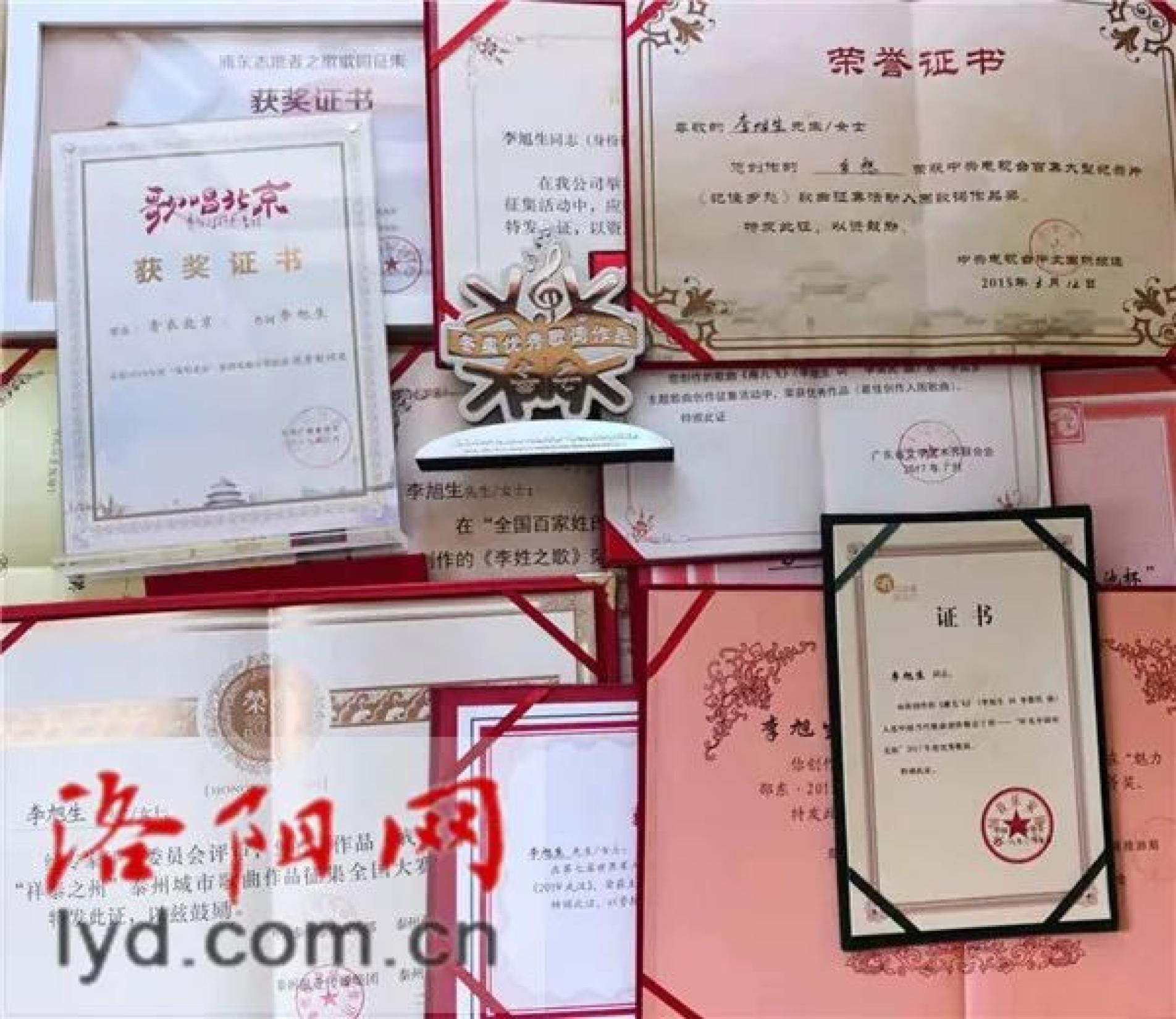 李旭生通过写歌词获得的部分获奖证书第一首歌词凭感觉一气呵成,词作家阎肃为他改词