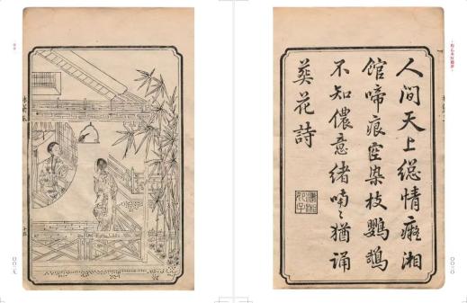 这首诗始见于乾隆五十六年辛亥(一七九一)本《红楼梦》——程伟元、高鹗整理刊行并且分别作序的木活字摆印本,次年刊行的壬子(一七九二)本,序像相同。书名题为“绣像红楼梦”,有二十四幅绣像,前像后赞。而这首吟咏潇湘馆的诗,是为第十五幅“林黛玉”的绣像题写的诗赞,取材于第三十五回鹦鹉吟诗的情节。如果沿着这首诗的路标找下去的话,沿途不难发现,除了木活字本,还有许多木刻本上都有相同的诗赞,可见其影响之大。