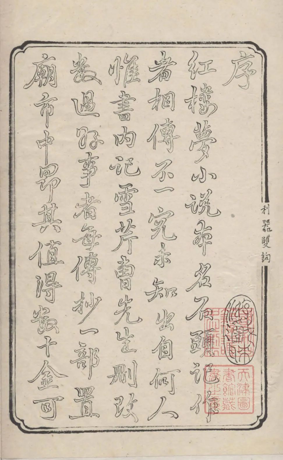 天津图书馆藏程乙本《红楼梦》卷首程伟元序首页(利器双钩)(一)书之首尾与序、像、目的完好无补。