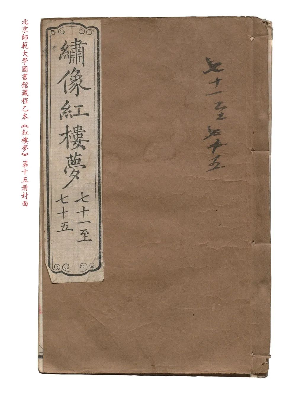 现知北师本、绍兴兰藏本、津图本,馆藏原件尚且存有相似的“绣像红楼梦” 书册面题签。从彼此相同,以及与社科院程甲本影印本上的书签比较,应为“萃文书屋”印刷装订时的原始书名题签。北师大程乙本尚有六册书留有封面题签,应为原始的初刊版本所有,也说明此版本尚未重装。幸存者集中在后四十回,可能因为翻阅次数较少。