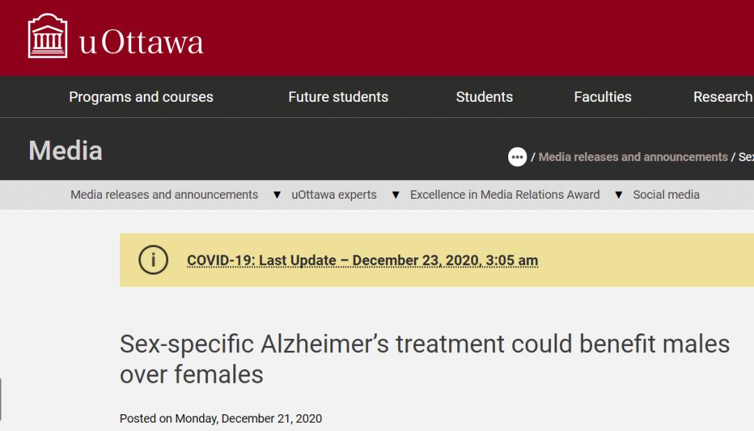 渥太华大学(University of Ottawa)的一项研究发现,一种特定的阿尔茨海默病治疗方法对雄性小鼠有效,而对雌性小鼠无效,这为研究这种疾病的生物学和靶向治疗的有效性提供了一个窗口。