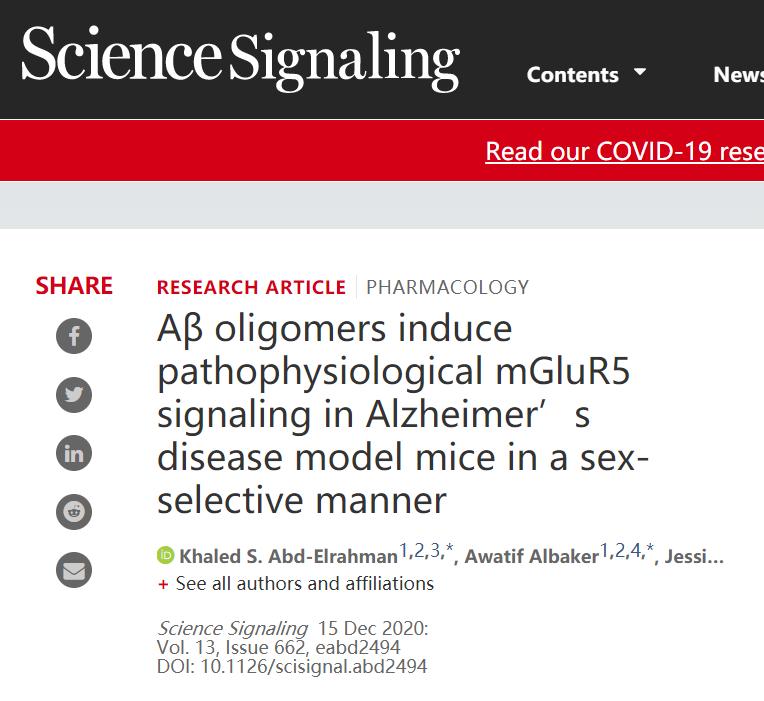 Khaled S. Abd-Elrahman, Awatif Albaker, Jessica M. de Souza, Fabiola M. Ribeiro, Michael G. Schlossmacher, Mario Tiberi, Alison Hamilton, Stephen S. G. Ferguson. Aβ oligomers induce pathophysiological mGluR5 signaling in Alzheimer’s disease model mice in a sex-selective manner. Science Signaling, 2020; 13 (662): eabd2494 DOI: 10.1126/scisignal.abd2494