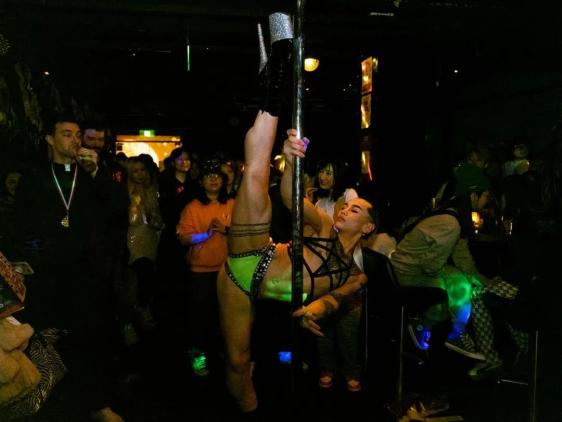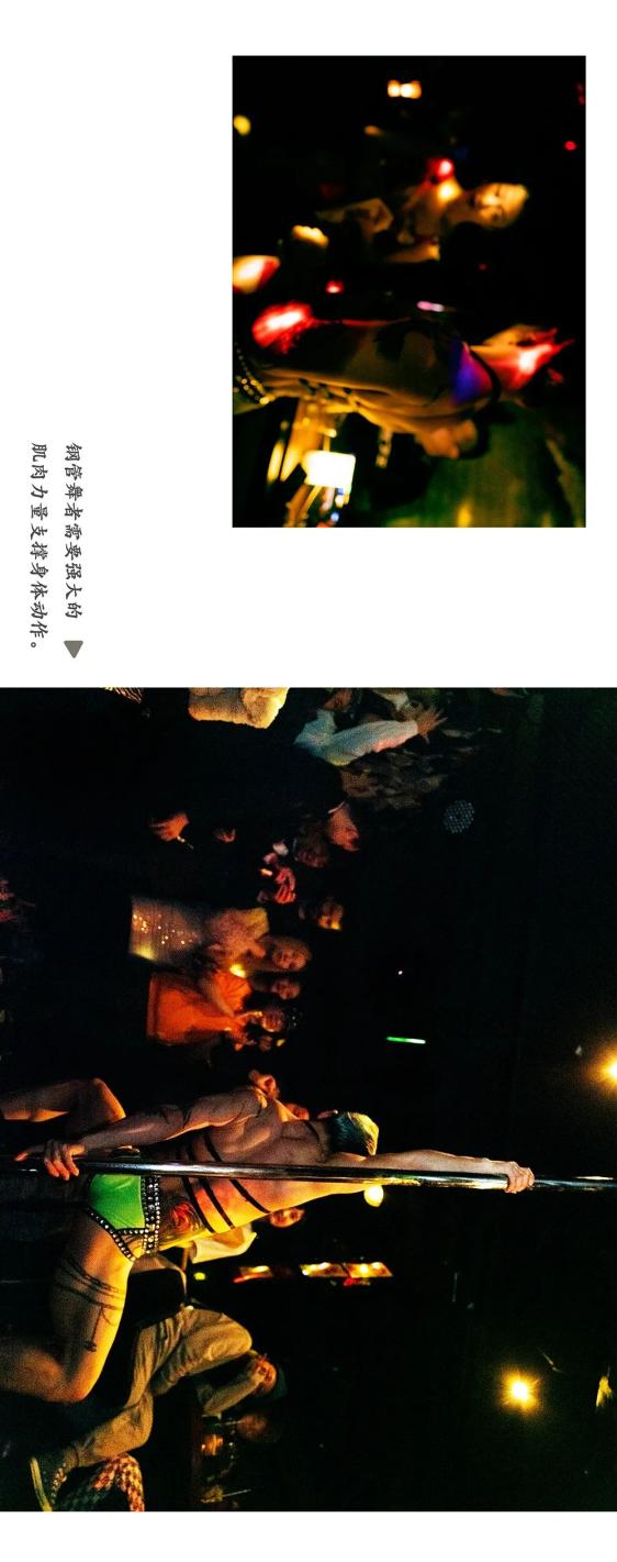 蓝发、红唇、超短裤。柯宏穿过人群,走向舞台。他双手握紧钢管,轻盈地移到半空,闭目旋转,银色高跟鞋随着身体的扭动闪过道道白光。6分钟后,表演结束。柯宏急匆匆地推门而去,不多停留。现在,他已极少在酒吧里表演了。