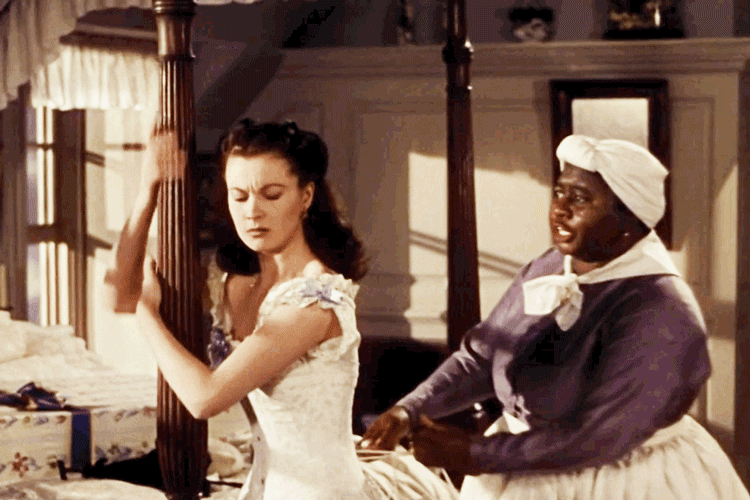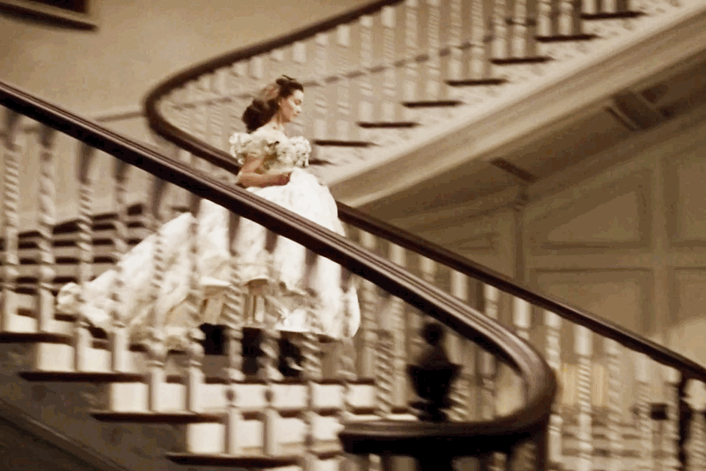 《乱世佳人》中,斯嘉丽的经典窗帘裙就是当时流行的“鸟笼”形制这样的大裙摆继承了洛可可风尚的曲线感,女孩子的腰肢显得更为纤细的同时胸部更为丰满。这其中紧身衣功不可没。