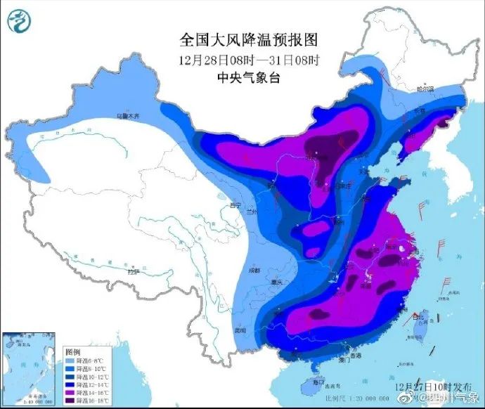 中国天气网气象分析师张娟表示,降温最剧烈的时段为12月29日至30日。