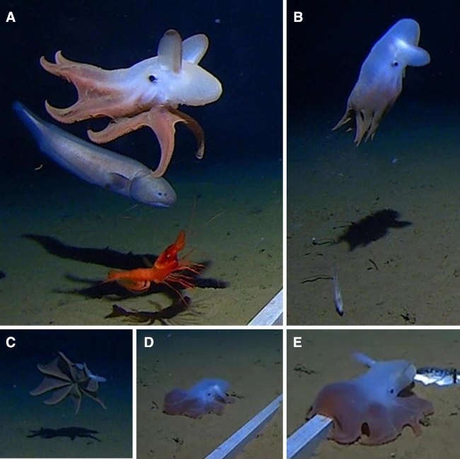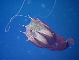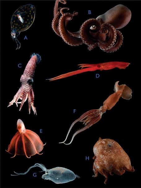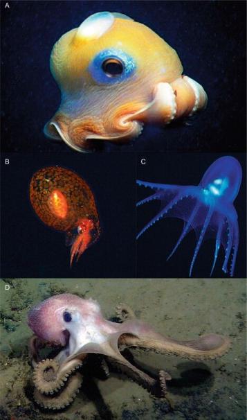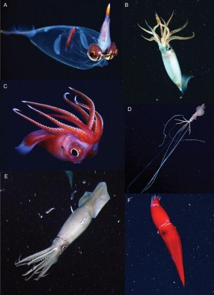 除了鱿鱼外,乌贼和章鱼也有生活在深海中的类群。除了形态较普通的僧头乌贼和单盘蛸,爱尔斗蛸,深海蛸之外,体态奇葩的章鱼也多如夜中繁星。