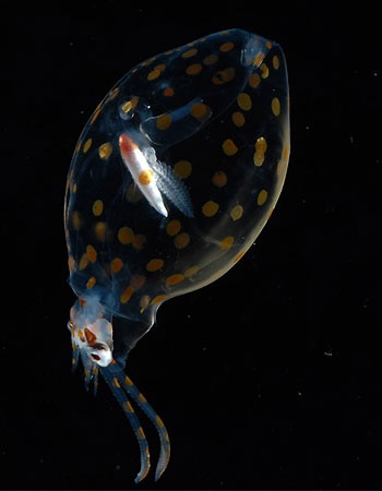 帆乌贼科,可见身上的发光器(红色点状物)。图片来源:Nature Picture Library