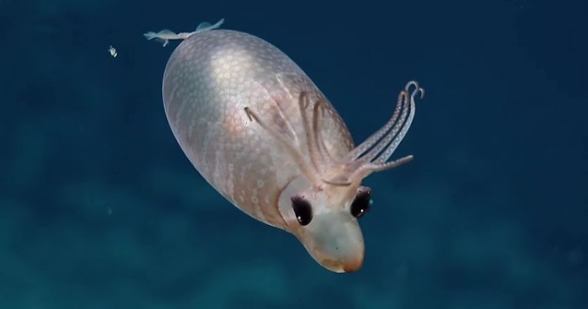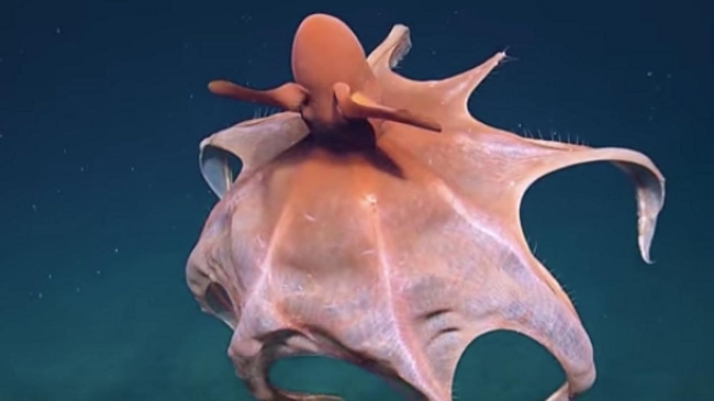 奇须蛸(Cirrothauma murrayi)。须蛸科十分特化,无其他头足类均具有的墨囊和齿舌,漏斗也没有喷射推进功能。图片来源:Reddit