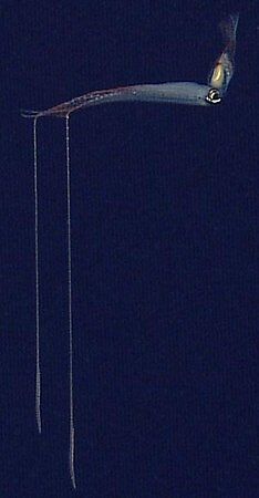 水中悬停的鞭乌贼,用触腕当作钓竿。推测其他具有长触腕的深海鱿鱼,如手乌贼和大王乌贼也具有同样的捕食方式。图片来源:维基百科