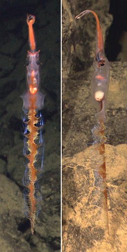 杯状手乌贼 (Chiroteuthis calyx)和被拟态的双小水母(Nanomia bijuga),图片来源:参考文献[7]