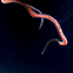 如同魔鬼般鲜红的鞭乌贼科(或鞭鱿科)是颜色最为鲜艳的深海鱿鱼之一,它们深红色的体表具大量红色色素沉着——在深海中,红色等于黑色。它们肌肉松软,游泳能力弱,取而用较大的鳍来推动身体。