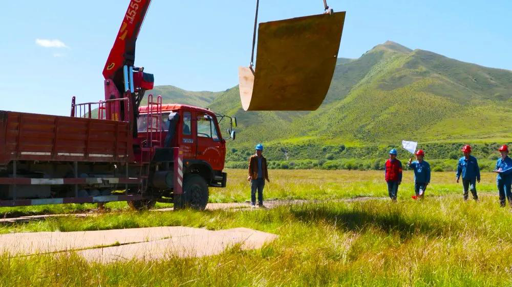 ▲铺设钢板供车辆行驶停放,最大程度地保护草根,甘南多雨,工程竣工后再撤掉钢板,只需一场雨,植被就可以恢复原样。