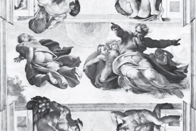 比如在米开朗琪罗创作的西斯廷壁画《创世》中,造物主被描绘成一个巨大的老人形象,身躯半裸,衣衫半掩,似乎被一群天使围绕着,靠他们在空中飞翔。他将造物主描绘地具体、生动、细致入微,更像是人,而不是神,从后方看时,我们甚至能认出造物主独特的臀形。