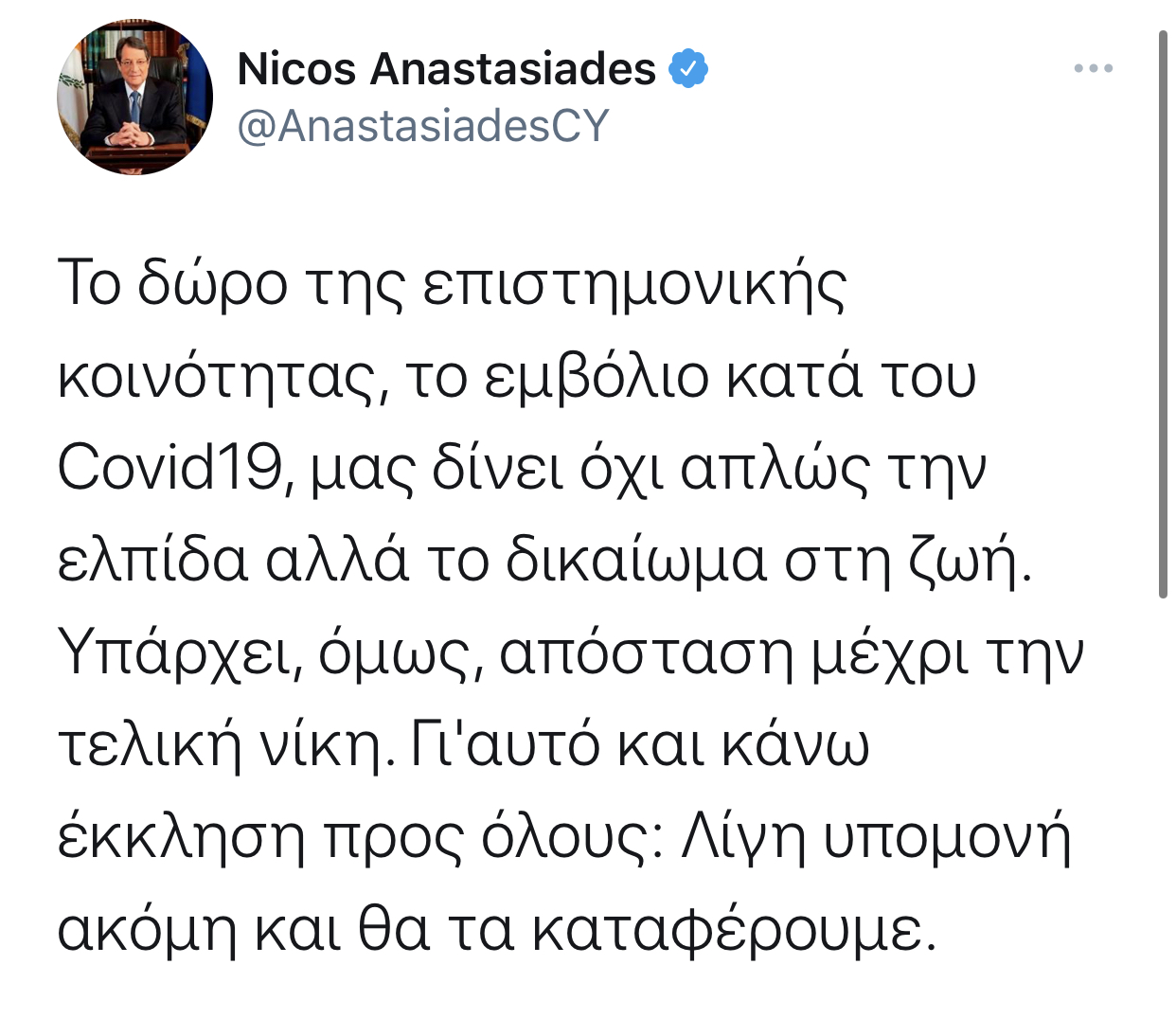 他在自己的社交媒体平台上发文并配上了自己接种疫苗的照片。他表示“这是科学给我们的礼物,新冠疫苗不仅给我们带来了希望,还给了我们拥有生命的权利。但是,我们距离最终的胜利还有一段距离,我在这里呼吁所有人,再多一些耐心,我们就会取得成功。”