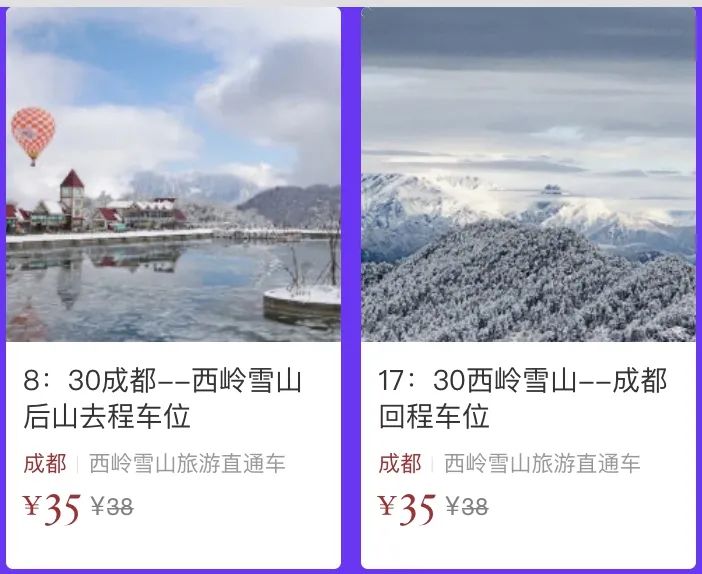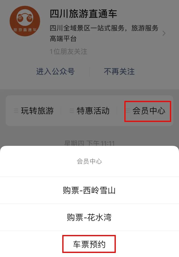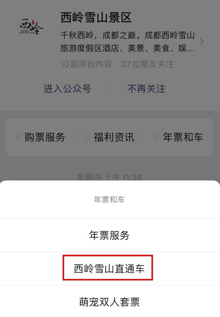 ①、关注“西岭雪山景区”微信公众号,点击下方菜单栏“年票和车”-“西岭雪山直通车”即可查看直通车余票库存;