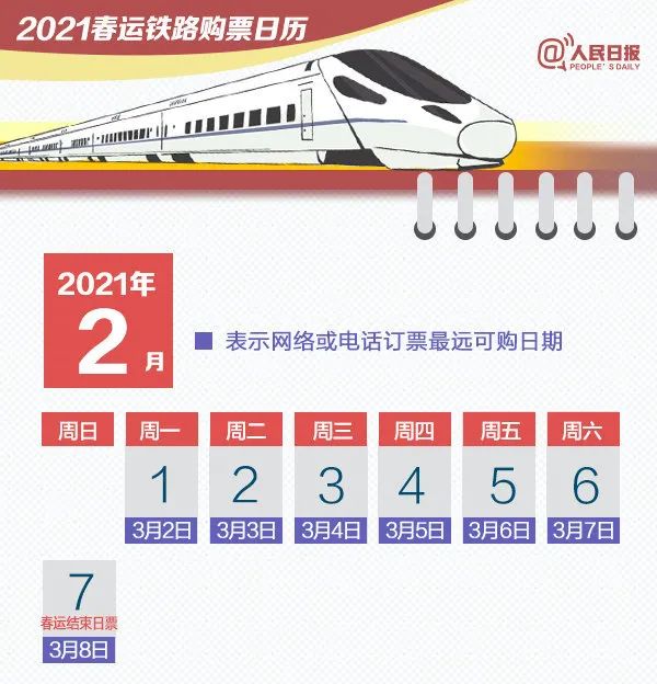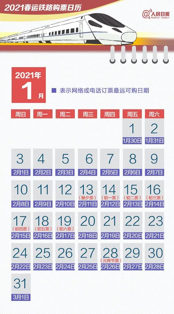 2021年铁路春运自1月28日开始,3月8日结束,共40天。按照火车票提前30天发售的安排,2020年12月30日,铁路部门开始发售2021年春运火车票。