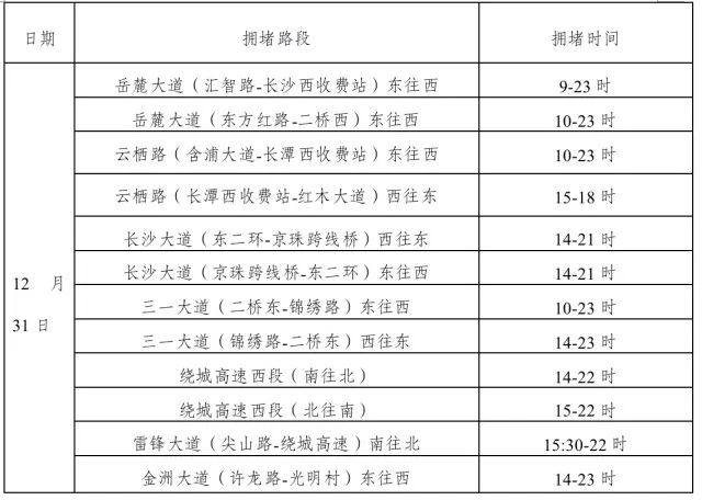 预计,节前(12月31日)下午至夜间时段为长沙城区交通状况最复杂、交通流量最大、拥堵指数最高的时段。其中,当天16时30分至20时,由于放学、下班、返乡、出城等多种交通流叠加,城区路网交通将长时间处于极度拥堵状态。
