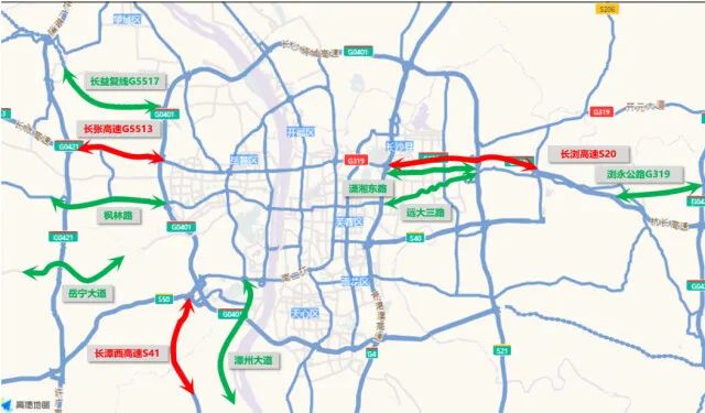 城区主要进出城道路方面:9时岳麓大道出城方向最先出现明显出城车流;10时云栖路、三一大道出城方向和岳麓大道进城方向车流逐步增加;13时长沙大道进出城方向车流逐步增加;14时黄桥大道、金洲大道、北二环、枫林三路、雷锋大道出城方向车流开始增加,同时连接长常北线高速的绕城高速开始出现车流上升;21时长沙大道进出城方向和枫林三路出城道路交通逐步恢复;22时除云栖路出城、金洲大道出城方向和岳麓大道出城方向以外,其他城区主要进出城通道道路交通基本恢复正常。