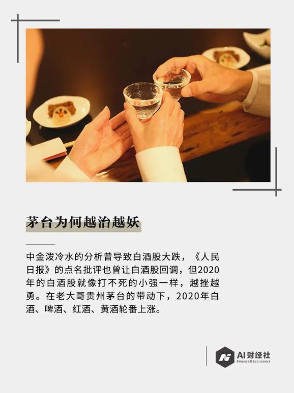 中金泼冷水的分析曾导致白酒股大跌,《人民日报》的点名批评也曾让白酒股回调,但2020年的白酒股就像打不死的小强一样,越挫越勇。然而“人无千日好,花无百日红”,谁也无法预料冲进去的那一刹那会不会就是白酒股崩盘的开始。